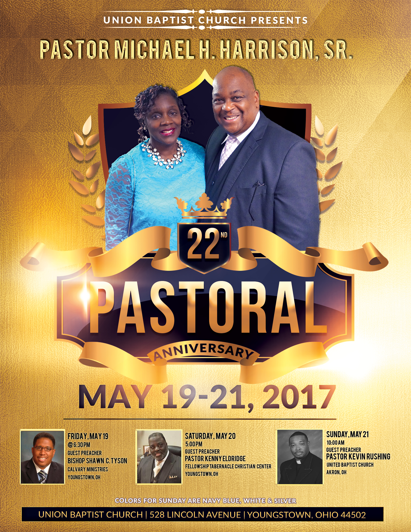 Event details Sunday | May 21, 2017 10:00 am 528 Lincoln Ave. Youngstown, OH 44502 Come celebrate with us, the Pastoral Anniversary of United’s own, Pastor Michael H. Harrison!!! Save Event to Calendar Save to iCalendar Save to Google Calendar Save to Outlook Save to Outlook Online Save to Yahoo! Calendar